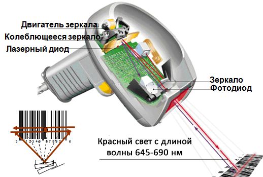 За счет колеблющегося зеркала лазерный луч быстро перемещается по штрих коду, в результате человеческий глаз принимает увиденное за красную полоску.